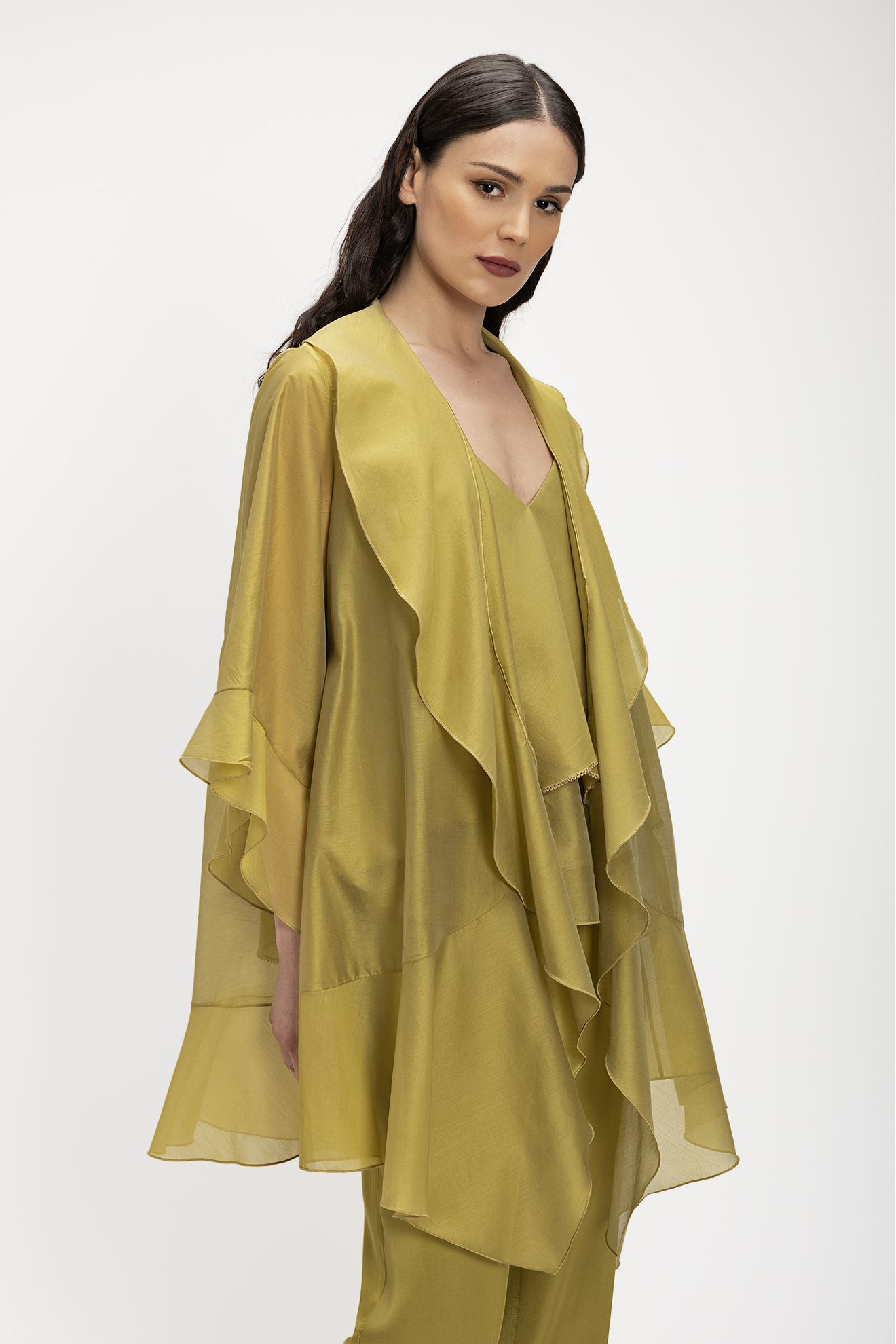 Ανάλαφρη τουνίκ από ημιδιάφανο ύφασμα που χαρίζει κομψή κίνηση και αέρινη αίσθηση. Διαθέτει ρευστά βολάν κατά μήκος, δημιουργώντας θηλυκή και εντυπωσιακή σιλουέτα, ενώ τα μανίκια ολοκληρώνονται με απαλό κυματιστό τελείωμα. Ιδανική για elegant εμφανίσεις με ιδιαίτερο χαρακτήρα.