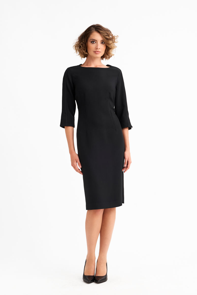 Εντυπωσιακό φόρεμα σε άριστης ποιότητας κρεπ ελαστικό ύφασμα, σε διαχρονική εφαρμοστή γραμμή που αναδεικνύει τη σιλουέτα. Διαθέτει κομψό σχέδιο φάσας στο μανίκι, το οποίο συνεχίζει μέχρι τον λαιμό και τονίζεται με φίνο ρελί στο ίδιο χρώμα για διακριτική πολυτέλεια. Ένα basic αλλά εξαιρετικά θηλυκό κομμάτι, ιδανικό για όλες τις ώρες της ημέρας. Συνδυάστε το με σακάκι ή παλτό της συλλογής και ολοκληρώστε την εμφάνιση με τα κατάλληλα αξεσουάρ.