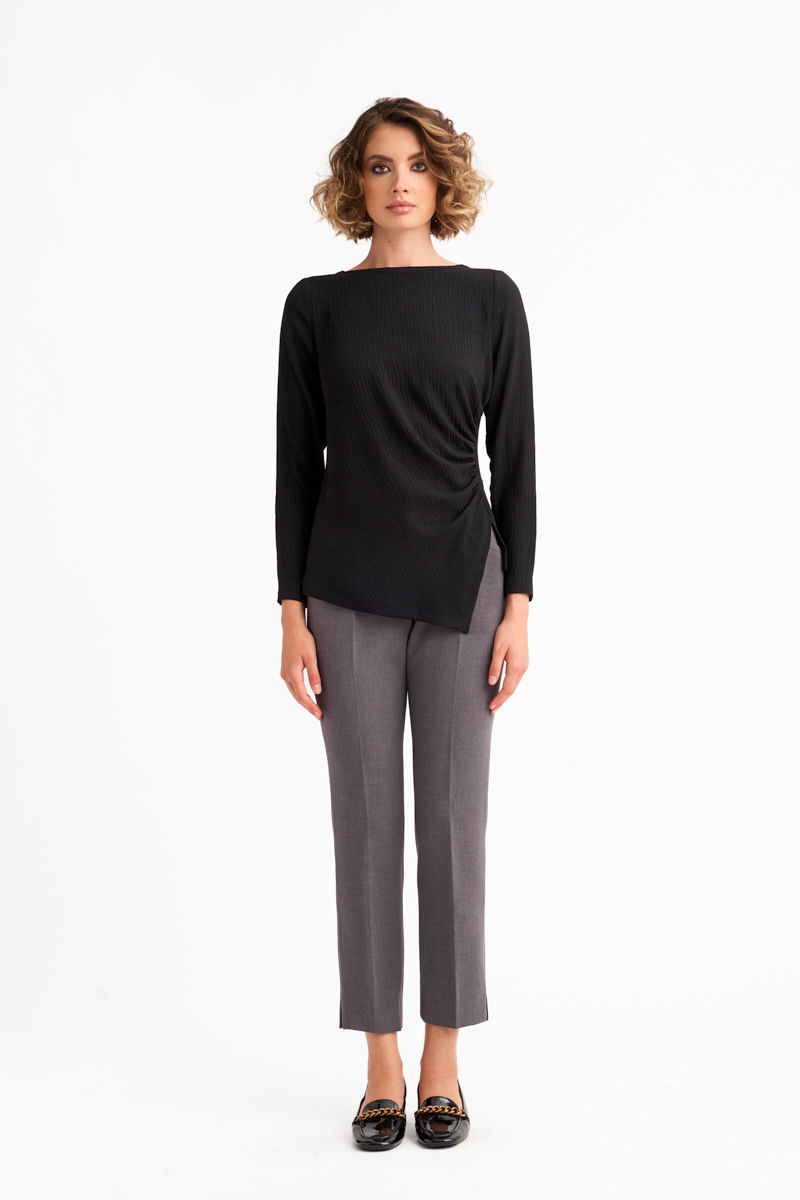 Κομψή μπλούζα από γκοφρέ ελαστικό ύφασμα με ιδιαίτερη υφή που προσφέρει άνεση και στυλ. Διαθέτει μοντέρνο σχέδιο με σούρες στο πλάι που αγκαλιάζουν τη σιλουέτα και δημιουργούν θηλυκή γραμμή. Το ασύμμετρο στρίφωμα και η διακριτική λαιμόκοψη bateau προσθέτουν έναν αέρα minimal κομψότητας. Ιδανική επιλογή για σύγχρονα office looks ή βραδινές εμφανίσεις με διακριτική φινέτσα.