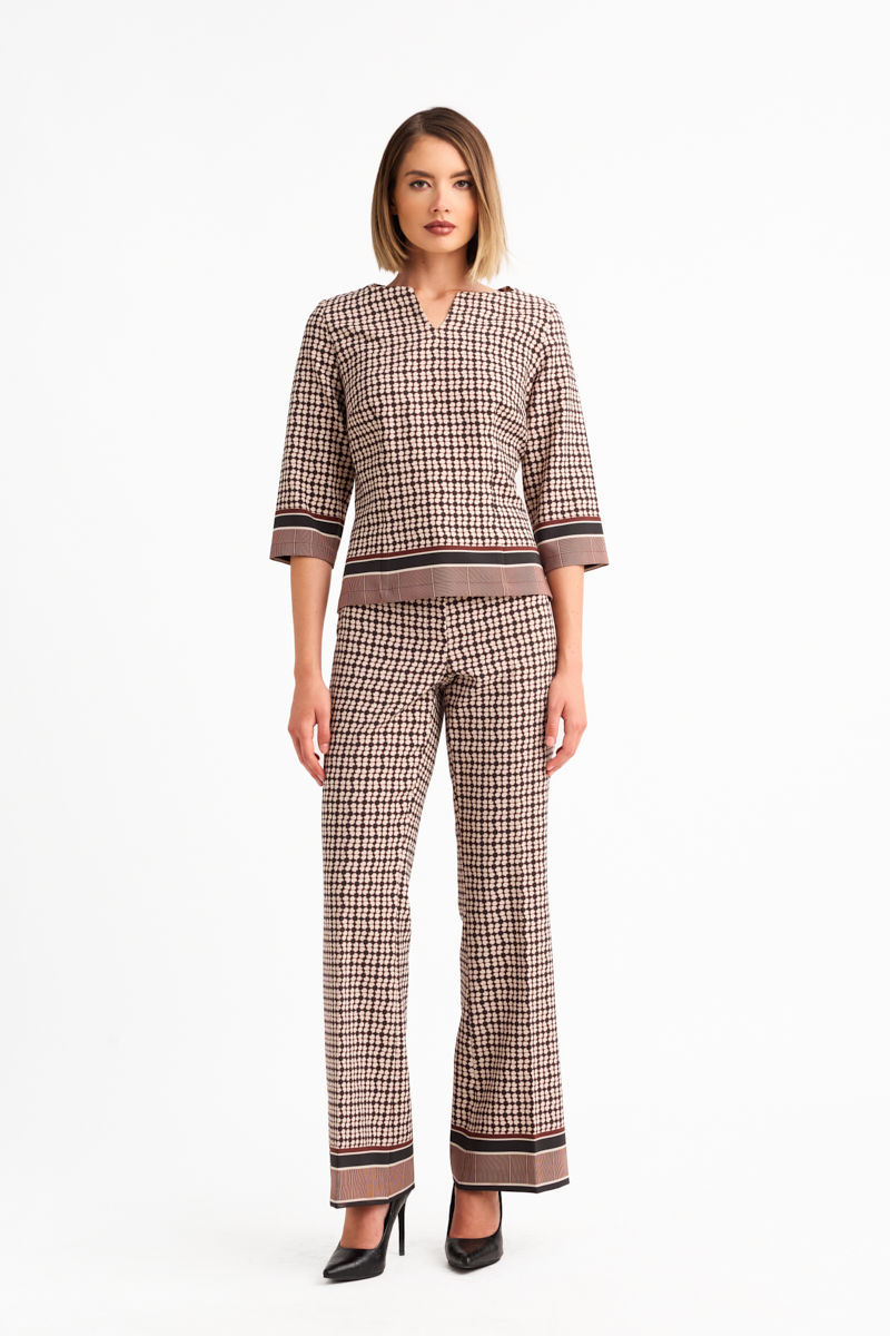 Κομψή μπλούζα από κρεπ ελαστικό ύφασμα με γεωμετρικό print. Η μπορντούρα του υφάσματος διακοσμεί το τελείωμα και τα μανίκια, δημιουργώντας μια εκλεπτυσμένη και ισορροπημένη αντίθεση. Η λαιμόκοψη έχει διακριτική στρογγυλή γραμμή που χαρίζει κομψότητα και άνεση, ιδανική για all-day εμφανίσεις