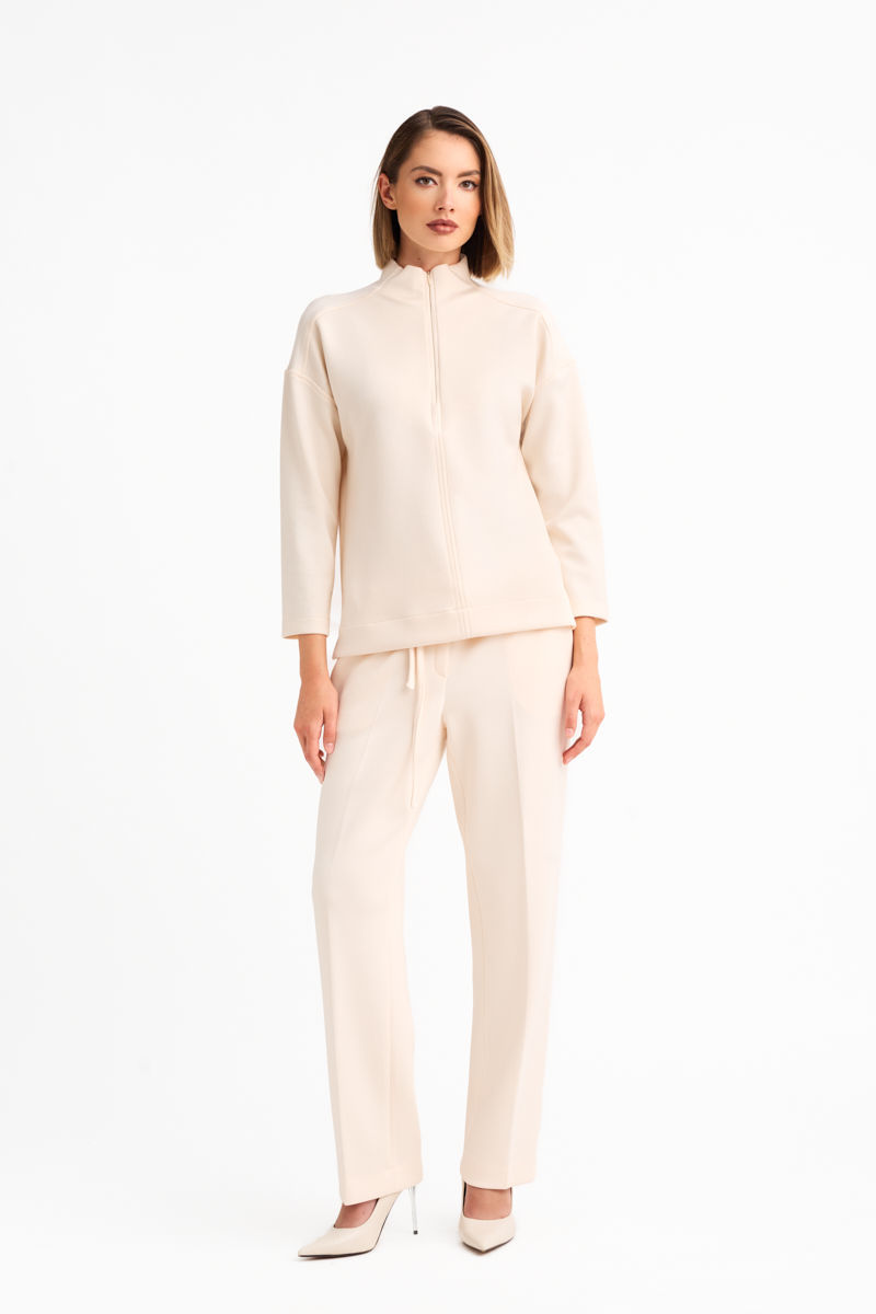 Μπλούζα σε άνετη γραμμή από ελαστικό τύπου scuba με απαλή αφή ύφασμα. Ο γιακάς κλείνει μπροστά με φερμουάρ που ανοίγει μέχρι τον λαιμό, προσδίδοντας μοντέρνο χαρακτήρα. Διαθέτει κοψίματα στους ώμους, ενώ οι ραφές είναι τονισμένες με εξώραφο για διακριτική αλλά ιδιαίτερη λεπτομέρεια. Μια minimal επιλογή με σύγχρονη αισθητική και άνετη εφαρμογή.