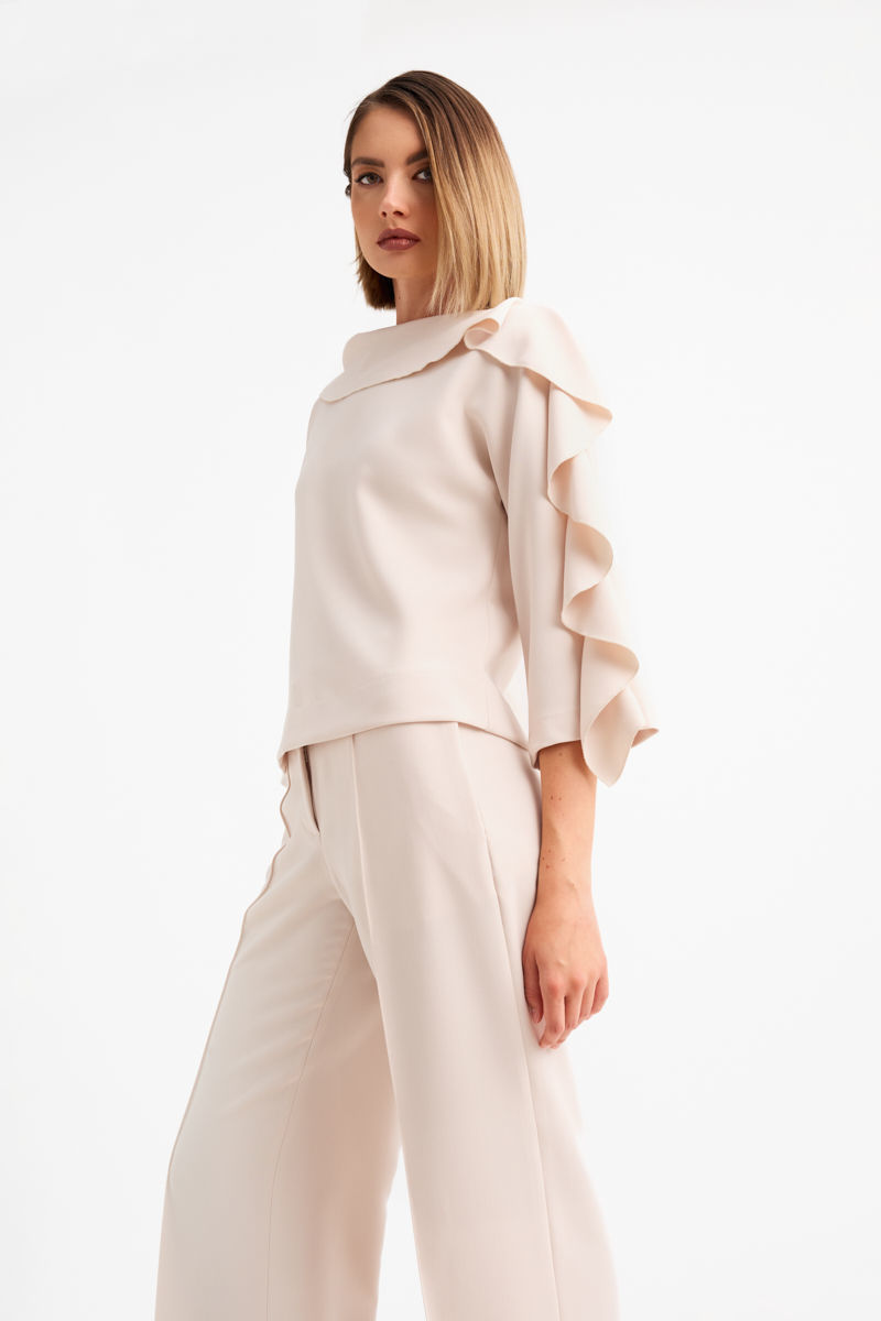Μπλούζα από υψηλής ποιότητας ελαστικό κρεπ ύφασμα, με ζαπονέ μανίκια και ιδιαίτερη, θηλυκή γραμμή. Το βολάν ξεκινά από τον λαιμό, σχηματίζοντας έναν κομψό γιακά, και συνεχίζει κατά μήκος του αριστερού μανικιού, προσδίδοντας κίνηση και ρομαντική διάθεση στο σύνολο. Συνδυάζεται ιδανικά με τα παντελόνια της συλλογής για ένα ολοκληρωμένο, κομψό outfit που αναδεικνύει τη σύγχρονη θηλυκότητα.