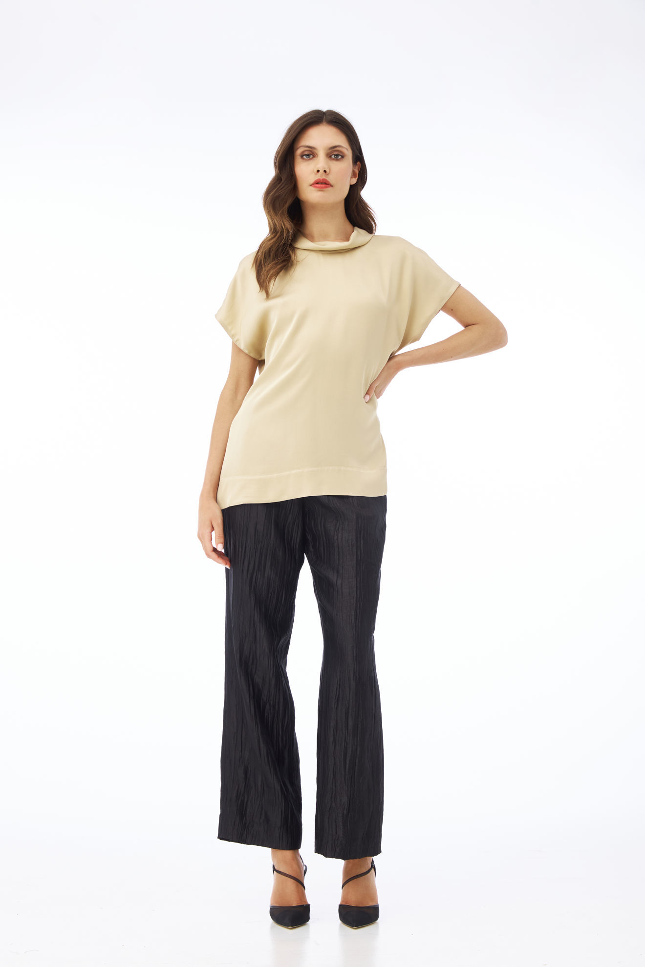 Μπλούζα σε σατέν βισκόζι με ζαπονέ μανίκια και λοξό γιακά που γυρίζει και κουμπώνει πίσω. Το τελείωμα διαθέτει φαρδύ στρίφωμα με μικρά ανοίγματα στο πλάι, προσθέτοντας μια διακριτική αλλά κομψή λεπτομέρεια. Ένα ρούχο λιτό αλλά με ιδιαίτερες γραμμές που χαρίζει άνεση και στυλ.