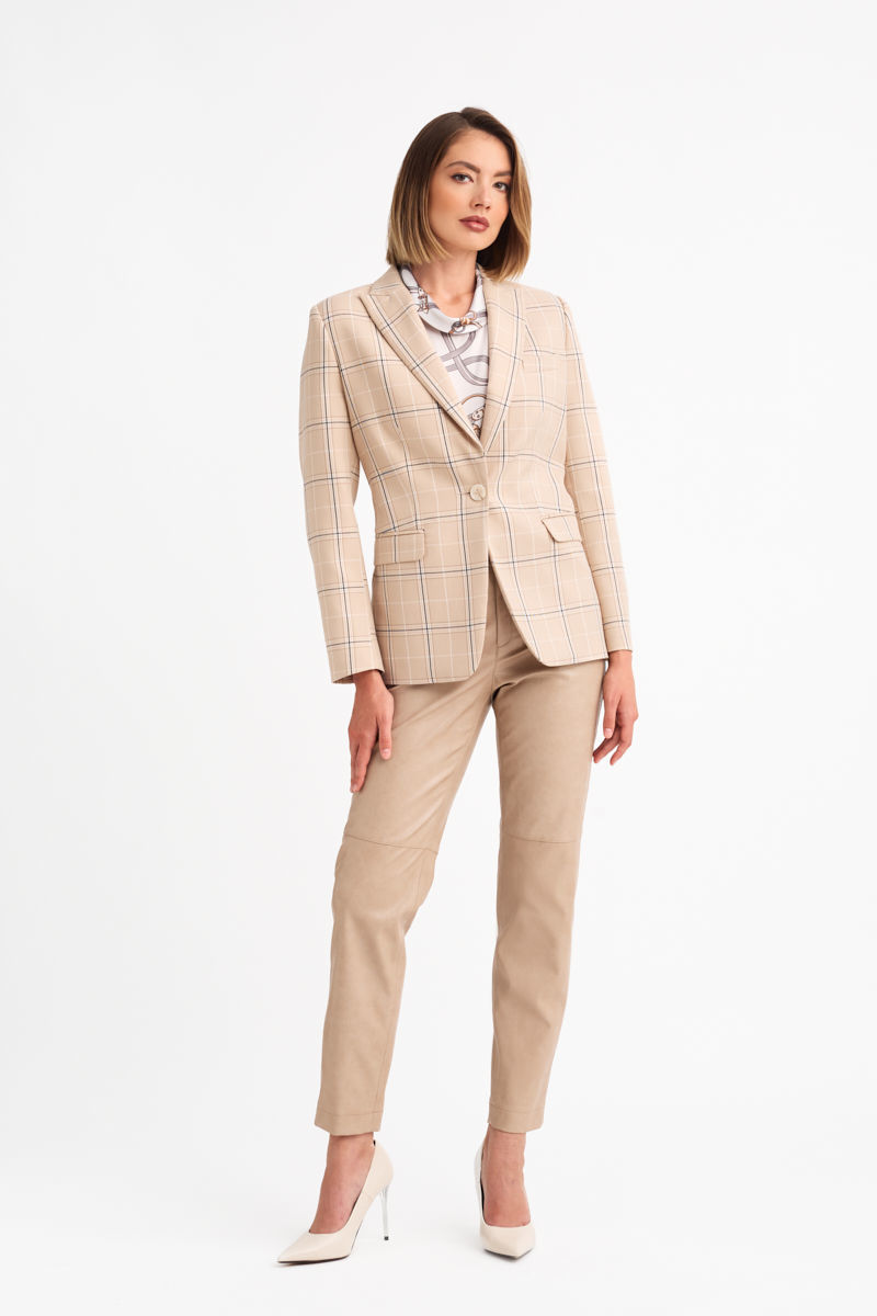 Κομψό σακάκι σε καρό ύφασμα με ελαστικότητα, που προσφέρει άνεση και τέλεια εφαρμογή. Κλείνει με ένα κουμπί και διαθέτει διακριτικές ραφές που αναδεικνύουν τη γυναικεία γραμμή. Το καρό σχέδιο συνδυάζει απαλές αποχρώσεις του μπεζ, εκρού και λεπτές γραμμές σε γκρι τόνους, δημιουργώντας ένα διαχρονικό και εκλεπτυσμένο αποτέλεσμα.