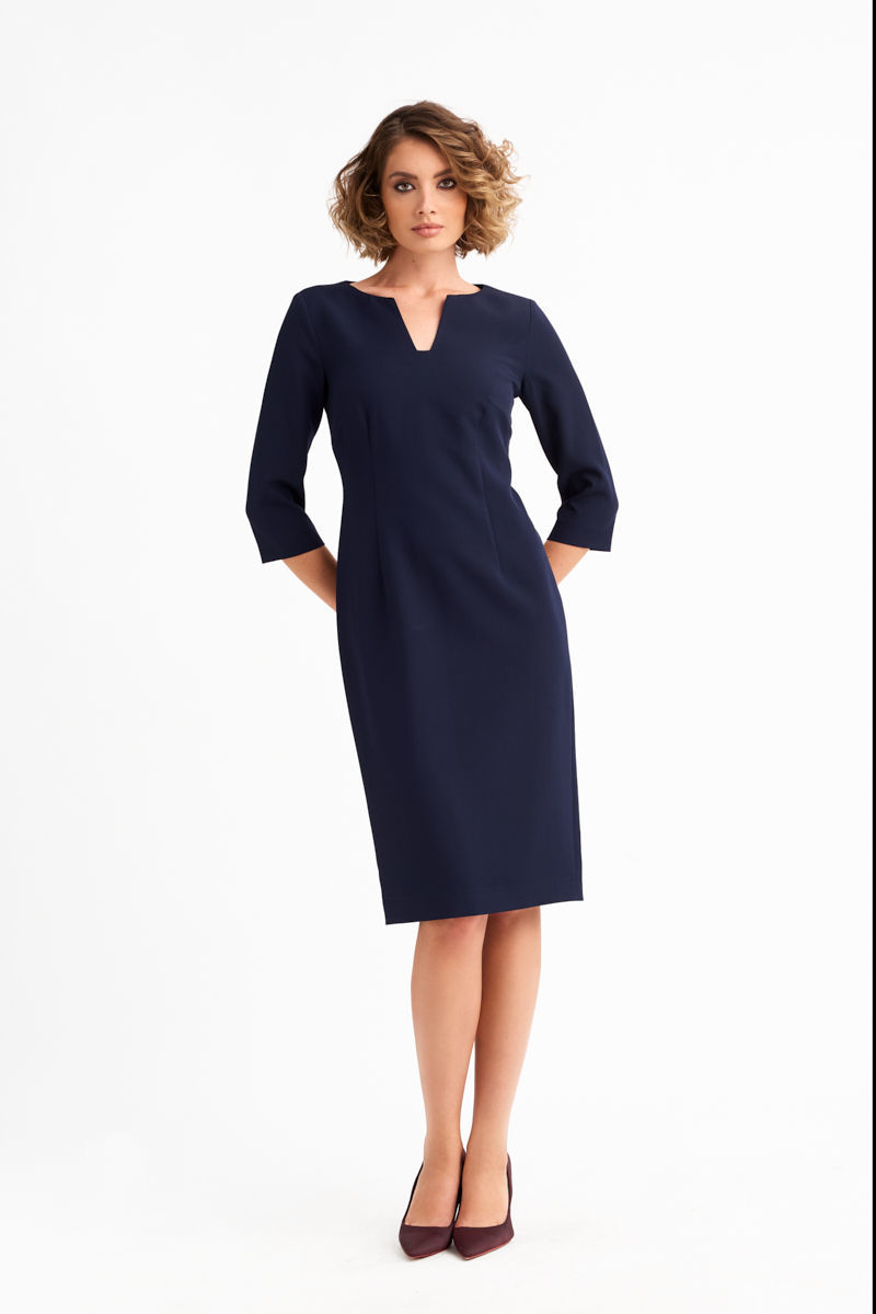 Φόρεμα από ελαστικό κρεπ ύφασμα σε midi μήκος, με εφαρμοστή γραμμή που αναδεικνύει τη θηλυκότητα. Η λαιμόκοψη είναι bateau με διακριτικό γεωμετρικό σχήμα που χαρίζει μοντέρνα πινελιά, ενώ τα μανίκια ? προσφέρουν κομψότητα και ευκολία στην κίνηση. Ένα διαχρονικό κομμάτι, ιδανικό για επαγγελματικές ή βραδινές εμφανίσεις, που συνδυάζεται άψογα με σακάκι ή παλτό της συλλογής.