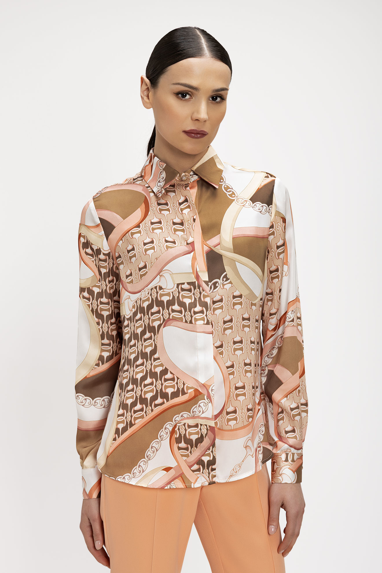 Κλασικό πουκάμισο σε ίσια γραμμή με εντυπωσιακό foulard print σε έντονες αποχρώσεις. Διαθέτει κομψό γιακά και μανσέτες που στολίζονται με διακριτικά περλέ κουμπιά, προσθέτοντας μια πινελιά πολυτέλειας. Η πατιλέτα έχει κρυφό κούμπωμα για καθαρό και μίνιμαλ αποτέλεσμα, ενώ το στρίφωμα έχει ελαφριά καμπύλη για τέλεια εφαρμογή είτε φορεθεί από μέσα είτε από έξω. Ένα ιδιαίτερο κομμάτι που συνδυάζει την κλασική ραφή με ένα μοντέρνο και δυναμικό μοτίβο.