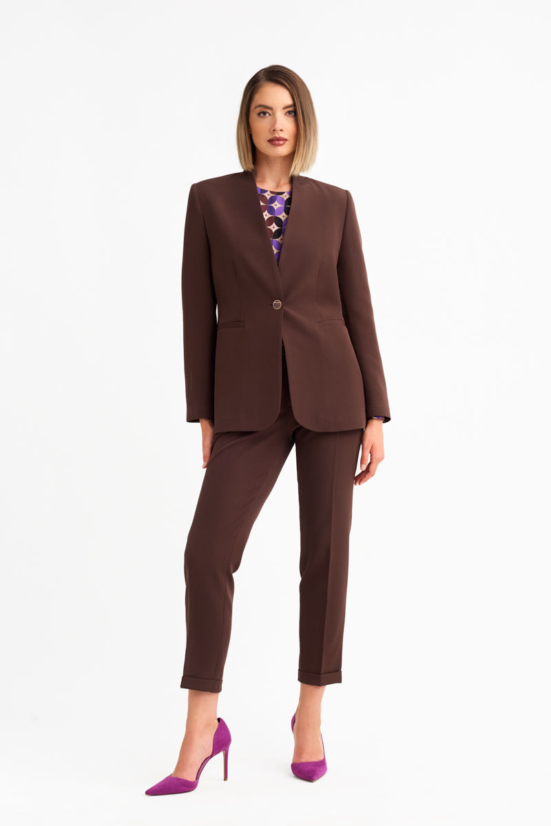 Κομψό σακάκι από ελαστικό κρεπ ύφασμα με εξαιρετική εφαρμογή. Διαθέτει όρθιο γιακά και κλείνει με ένα κουμπί μπροστά, αναδεικνύοντας τη γυναικεία σιλουέτα με διακριτική φινέτσα. Το minimal design του το καθιστά ιδανικό για επαγγελματικές ή πιο formal εμφανίσεις. Συνδυάζεται άψογα με παντελόνια ή φούστες της συλλογής για ένα ολοκληρωμένο και εκλεπτυσμένο look.