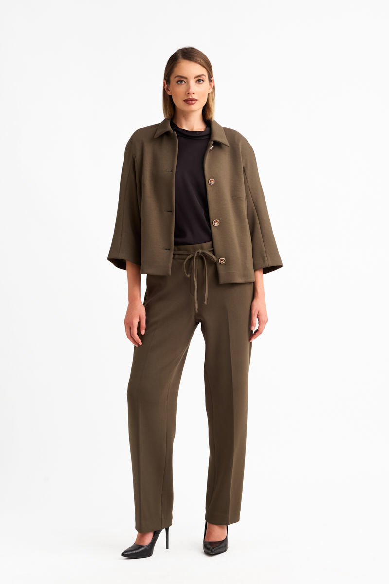 Κοντό σακάκι από τύπου scuba με απαλή αφή με ίσια γραμμή και χαλαρή εφαρμογή. Διαθέτει κλασικό γιακά, υπέροχα κουμπιά στο μπροστινό μέρος και τονισμένες ραφές στα στριφώματα είναι τονισμένες με εξώραφο για διακριτική αλλά ιδιαίτερη λεπτομέρεια στα μανίκια. Ένα μοντέρνο κομμάτι που συνδυάζει άνεση και στυλ, ιδανικό τόσο για casual όσο και για πιο επίσημες εμφανίσεις. Συνδυάζεται αρμονικά με το παντελόνι της ίδιας σειράς.
