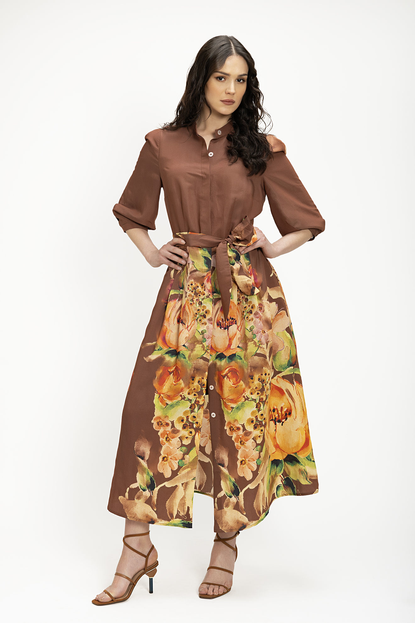 Κομψό midi σεμιζιέ φόρεμα από αέρινη βισκόζη, με εντυπωσιακό καλλιτεχνικό εμπριμέ με μεγάλα τριαντάφυλλα. Διαθέτει στυλιζαρισμένο μπούστο και μανίκια με διακριτικά πιετάκια στους ώμους και τις μανσέτες για έξτρα θηλυκότητα. Η πλούσια φούστα με τις πτυχώσεις χαρίζει μοναδική κίνηση, ενώ η ενσωματωμένη ζώνη που ξεκινά από την πίσω πένσα και δένει εμπρός, αναδεικνύει τέλεια τη μέση. Ένα statement κομμάτι που συνδυάζει την κλασική φινέτσα με το σύγχρονο στυλ