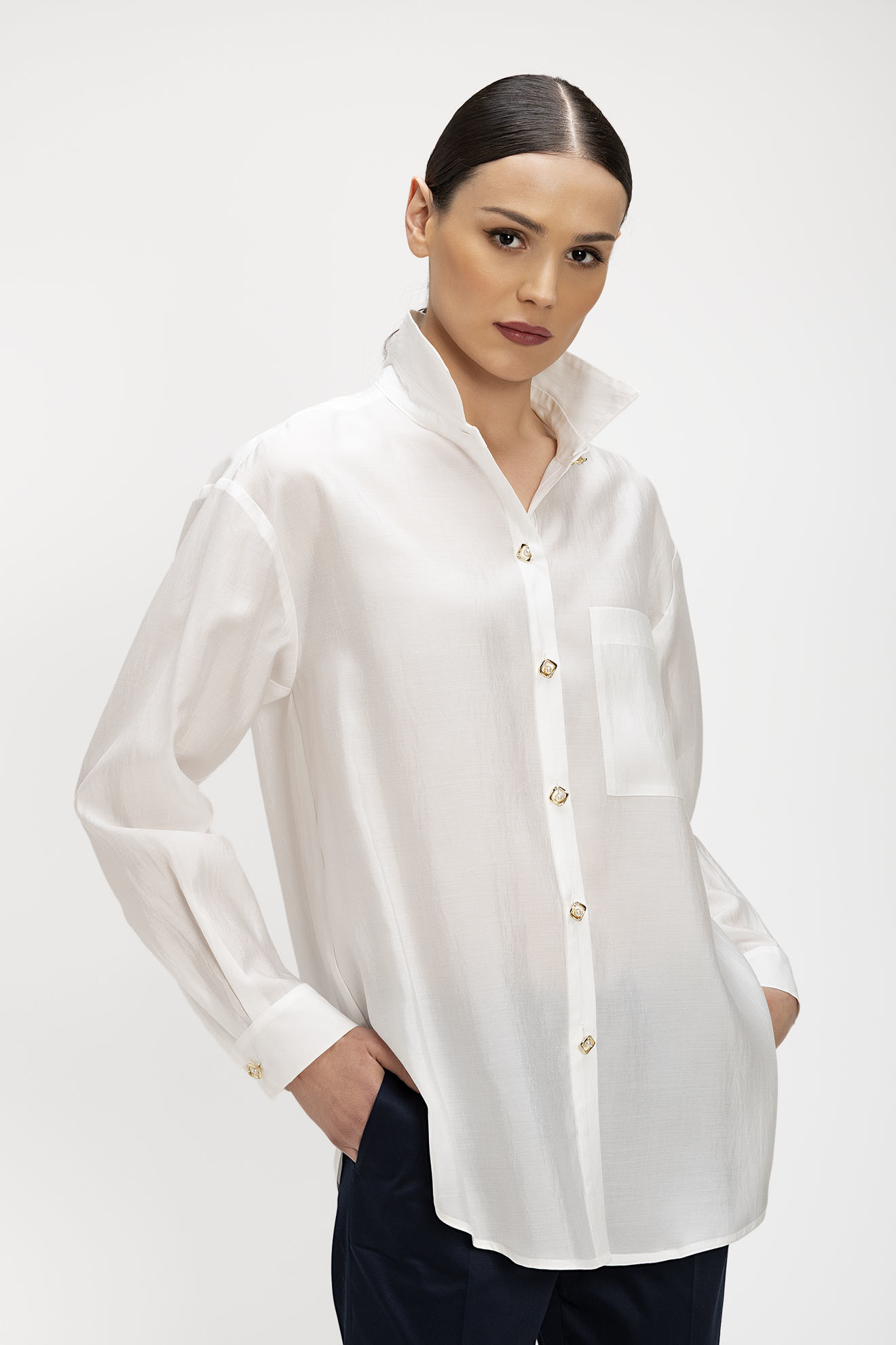 Πουκάμισο σε ανάλαφρο ύφασμα με απαλή υφή και κομψή πτώση. Διαθέτει κλασικό γιακά και πατιλέτα μπροστά με χρυσά διακοσμητικά κουμπιά που προσθέτουν μία elegant πινελιά. Η χαλαρή γραμμή και το ελαφρώς μακρύτερο μήκος προσφέρουν άνεση και σύγχρονη αισθητική, ενώ η τσέπη στο στήθος ολοκληρώνει το minimal design. Τα μανίκια καταλήγουν σε μανσέτες για πιο προσεγμένο αποτέλεσμα. Ιδανικό για chic εμφανίσεις από το πρωί έως το βράδυ, συνδυάζεται εύκολα με tailored παντελόνια ή κοστούμια.