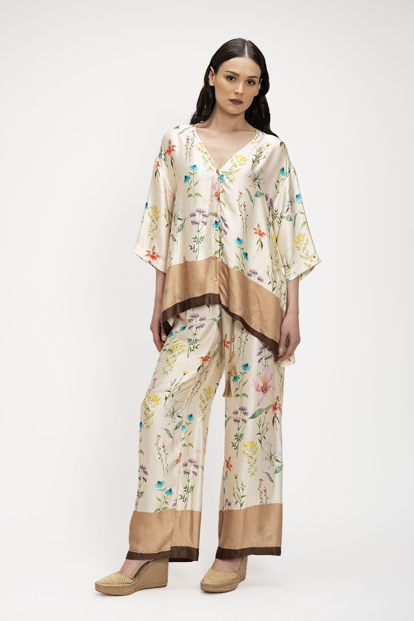 Αέρινο πουκάμισο από σατέν βισκόζη με απαλή υφή και φυσική γυαλάδα. Διαθέτει χαλαρή γραμμή με V λαιμόκοψη και κουμπιά μπροστά, ενώ τα μανίκια έχουν ρευστή εφαρμογή που χαρίζει άνεση. Το εμπριμέ σχέδιο ολοκληρώνεται με μπορντούρα στο τελείωμα, αναδεικνύοντας κομψά το floral μοτίβο.