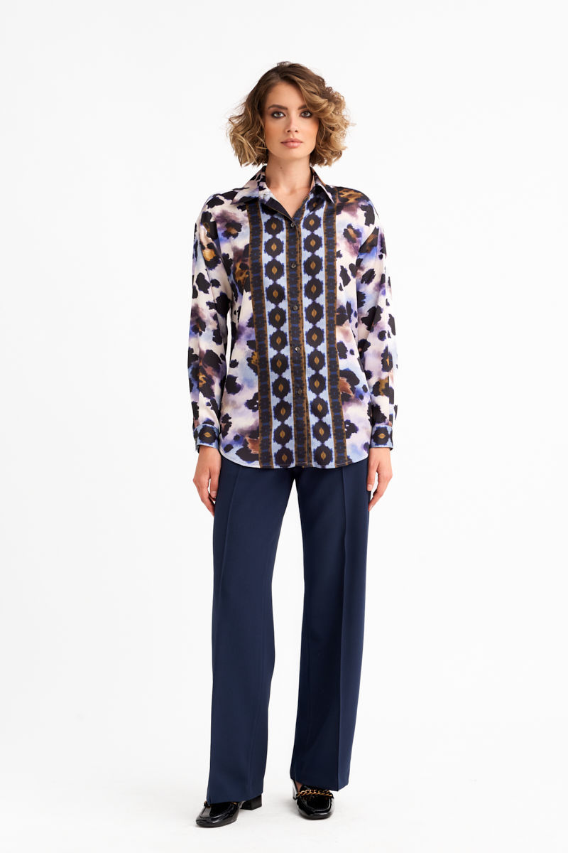 Πουκάμισο σε γραμμή oversized από απαλή, σατινέ ύφανση με εντυπωσιακό εμπριμέ μοτίβο. Διαθέτει μπορντούρα μπροστά στον ώμο, γιακά και μακριά μανίκια. Η άνετη εφαρμογή του προσφέρει κομψότητα και ευκολία στην κίνηση. Ένα ιδιαίτερο κομμάτι που συνδυάζει μοντέρνο στυλ και διακριτική πολυτέλεια, ιδανικό για κάθε περίσταση.