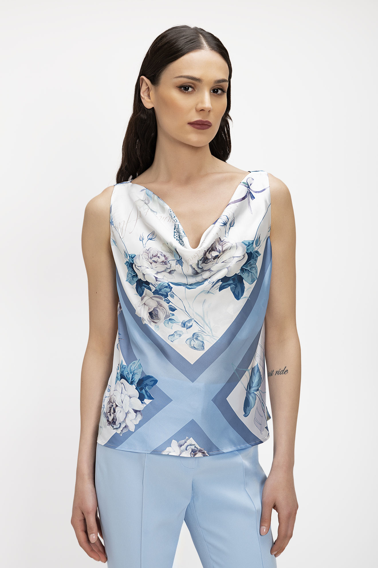 Εντυπωσιακό τοπ από πολυτελές σατέν ύφασμα με ιδιαίτερο foulard print σε έντονες αποχρώσεις. Διαθέτει κομψό ντραπέ λαιμό που πέφτει όμορφα στο στήθος, προσδίδοντας κίνηση και θηλυκότητα. Η αέρινη γραμμή του και η λάμψη του σατέν το καθιστούν ιδανική επιλογή για να δώσετε χρώμα και ενδιαφέρον μέσα από το κοστούμι σας ή να το φορέσετε μόνο του για μια chic βραδινή εμφάνιση