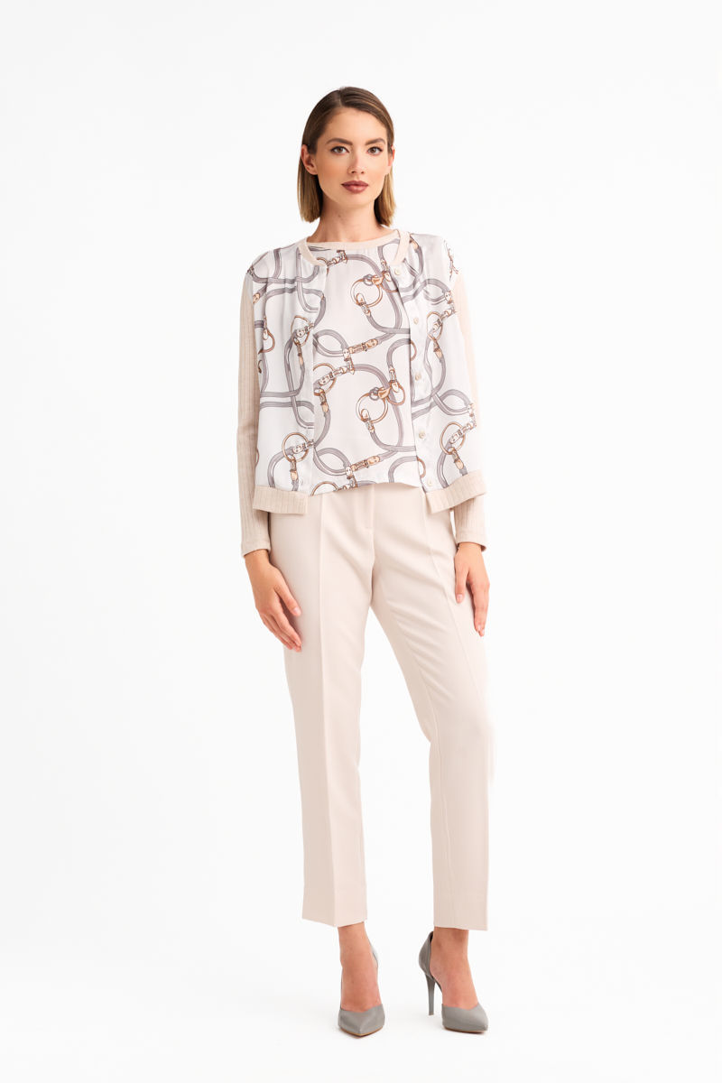 Twin set με ζακετάκι και μπλούζα σε σατέν εμπριμέ ύφασμα και πλεκτό. Το εμπρός μέρος της ζακέτας είναι από το ανάλαφρο, γυαλιστερό σατέν εμπριμέ ύφασμα, ενώ το πίσω μέρος και τα μανίκια από μαλακό πλεκτό για άνεση και κίνηση. Κουμπώνει με μεταλλικά κουμπιά που προσθέτουν διακριτική λάμψη. Η μπλούζα συνδυάζει το ίδιο εμπριμέ σατέν εμπρός με πλεκτό πίσω μέρος, ενώ ο λαιμός και οι μασχάλες καθαρίζουν με πλεκτή φάσα για αρμονικό τελείωμα.