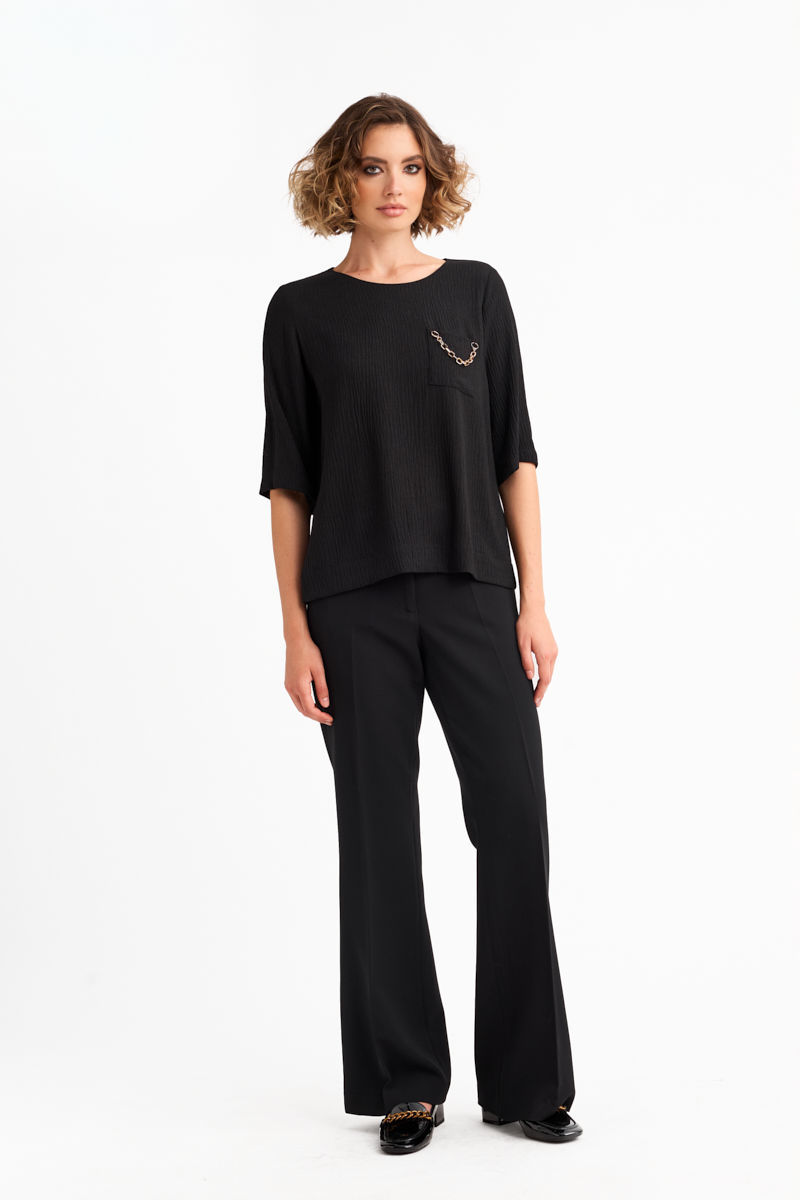 Κομψή μπλούζα από γκοφρέ ελαστικό ύφασμα σε ίσια γραμμή, με στρογγυλή λαιμόκοψη και διακοσμητική τσέπη στο στήθος που στολίζεται με χρυσή αλυσίδα. Άνετη και σικάτη επιλογή για καθημερινές εμφανίσεις, που συνδυάζεται εύκολα με παντελόνια ή φούστες για ένα μοντέρνο, minimal look.