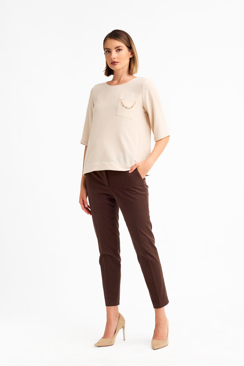 Κομψή μπλούζα από γκοφρέ ελαστικό ύφασμα σε ίσια γραμμή, με στρογγυλή λαιμόκοψη και διακοσμητική τσέπη στο στήθος που στολίζεται με χρυσή αλυσίδα. Άνετη και σικάτη επιλογή για καθημερινές εμφανίσεις, που συνδυάζεται εύκολα με παντελόνια ή φούστες για ένα μοντέρνο, minimal look.