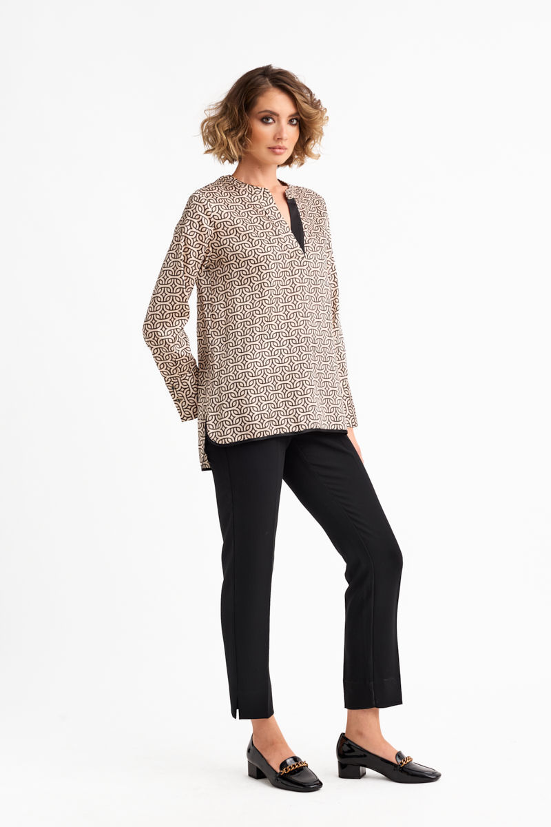 Εντυπωσιακή μπλούζα τύπου πουκαμίσα από απαλό, ρευστό ύφασμα με φίνα υφή και διακριτική γυαλάδα. Το γεωμετρικό σχέδιο χαρίζει μοντέρνο χαρακτήρα, ενώ η άνετη γραμμή της προσφέρει κομψότητα και ευκολία στην κίνηση. Το στρίφωνα είναι ρελιασμένο με μαύρο σατέν όπως η πατιλέτα στον λαιμό . Ιδανική επιλογή για ένα προσεγμένο καθημερινό ή επαγγελματικό look.