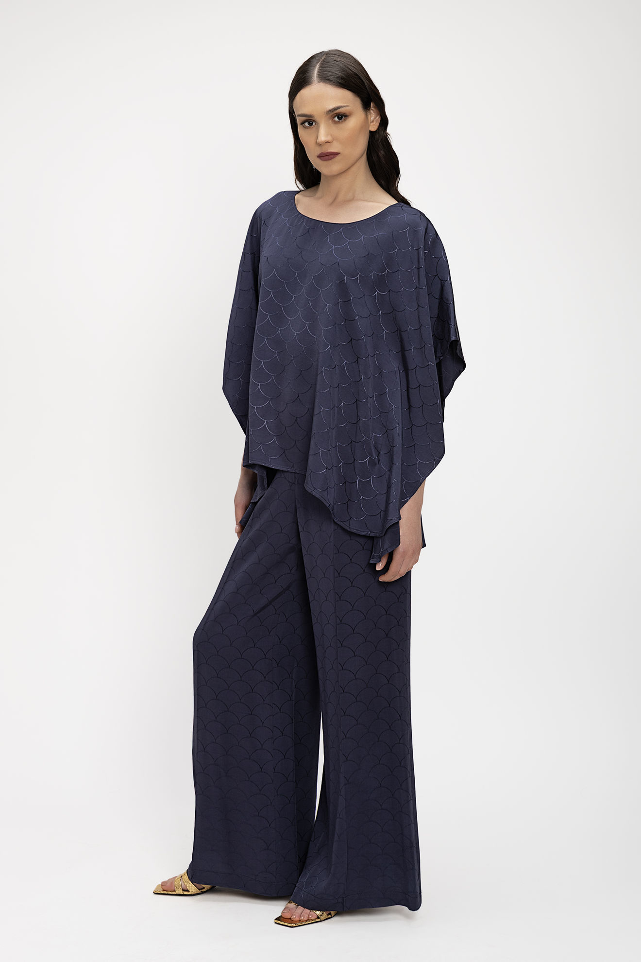 Εντυπωσιακή μπλούζα σε αέρινη γραμμή "νυχτερίδα", κατασκευασμένη από υψηλής ποιότητας βισκόζη με ιδιαίτερη ανάγλυφη ύφανση που θυμίζει λέπια. Το σχέδιο χαρακτηρίζεται από τα καμπυλωτά τελειώματα στα μανίκια και στο στρίφωμα, τα οποία χαρίζουν μια μοναδική κίνηση και χάρη σε κάθε βήμα. Διαθέτει κομψή λαιμόκοψη και άνετη εφαρμογή, αποτελώντας ένα statement κομμάτι που συνδυάζει την καλλιτεχνική αισθητική με την απόλυτη άνεση. Ένα ρούχο με πλούσιο όγκο και ξεχωριστή υφή, ιδανικό για να μαγνητίζει τα βλέμματα.