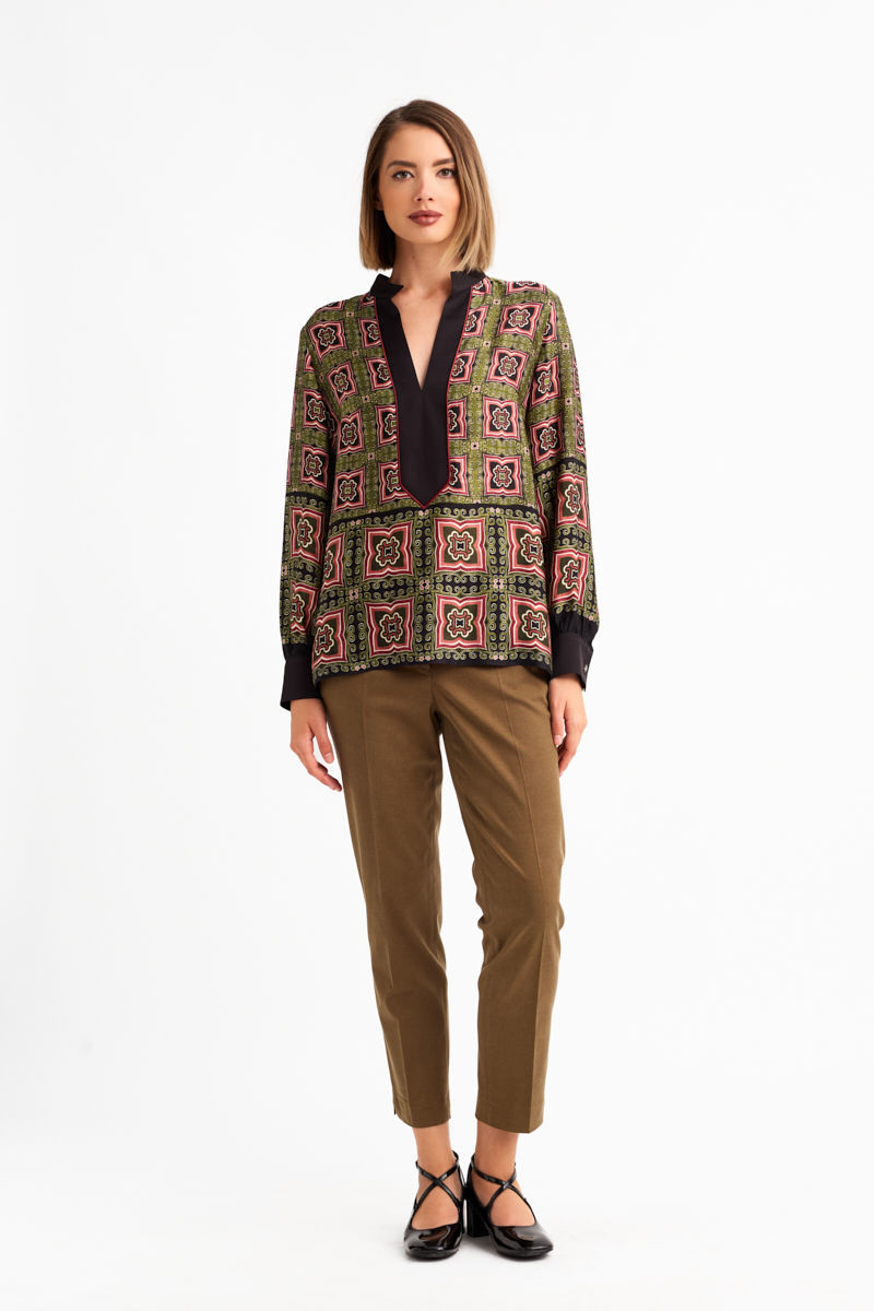 Μπλούζα από σατέν βισκόζι με εντυπωσιακό εμπριμέ μοτίβο, μαύρη φάσα στο ντεκολτέ, γιακά και μανσέτες, διακοσμημένες με ροζ ρέλι. Η μπορντούρα του υφάσματος στολίζει κομψά το στρίφωμα της μπλούζας και των μανικιών. Ένα θηλυκό και ιδιαίτερο κομμάτι σε μοναδικό συνδυασμό χρωμάτων, ιδανικό για κάθε στιγμή της ημέρας.