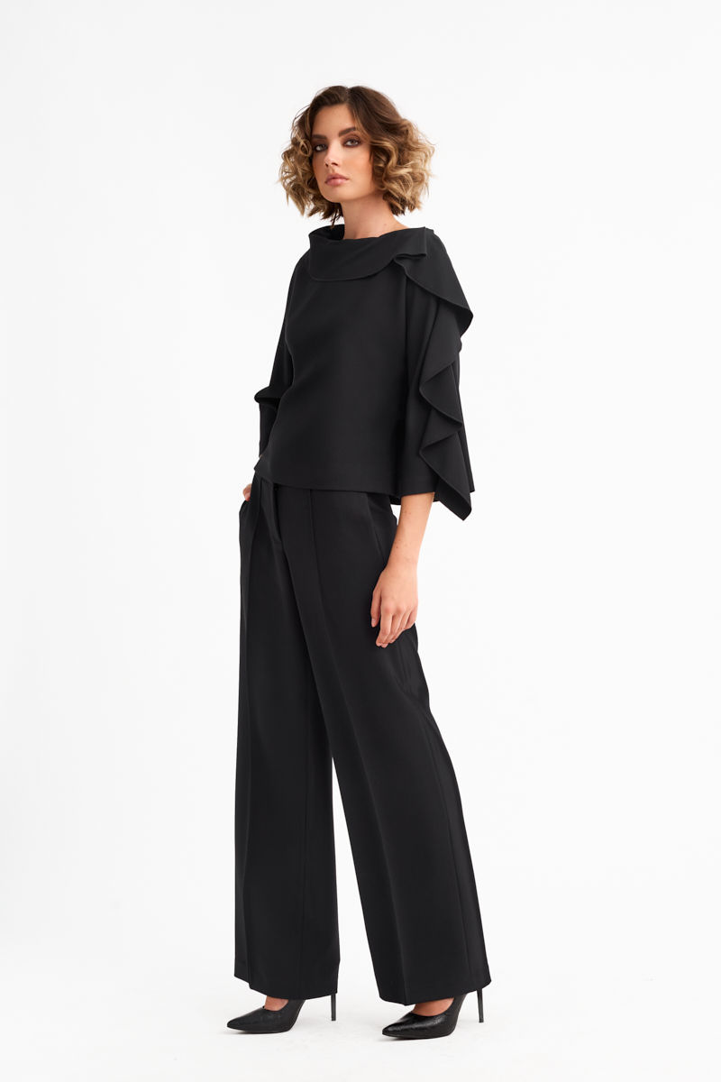 Μπλούζα από υψηλής ποιότητας ελαστικό κρεπ ύφασμα, με ζαπονέ μανίκια και ιδιαίτερη, θηλυκή γραμμή. Το βολάν ξεκινά από τον λαιμό, σχηματίζοντας έναν κομψό γιακά, και συνεχίζει κατά μήκος του αριστερού μανικιού, προσδίδοντας κίνηση και ρομαντική διάθεση στο σύνολο. Συνδυάζεται ιδανικά με τα παντελόνια της συλλογής για ένα ολοκληρωμένο, κομψό outfit που αναδεικνύει τη σύγχρονη θηλυκότητα.