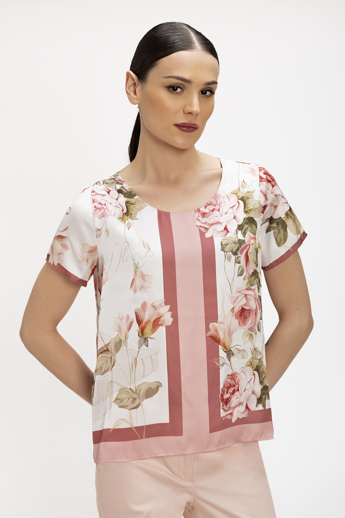 Μπλούζα από σατέν βισκόζη με απαλή υφή και φίνα γυαλάδα. Το σχέδιο fullard print με συνδυασμό floral και γεωμετρικών στοιχείων δημιουργεί ένα κομψό και σύγχρονο αποτέλεσμα. Διαθέτει στρογγυλή λαιμόκοψη και κοντό μανίκι, ενώ η μπορντούρα στο τελείωμα και στα μανίκια αναδεικνύει το pattern και προσθέτει ιδιαίτερο χαρακτήρα. Η ίσια, άνετη γραμμή την καθιστά ιδανική για καθημερινές αλλά και πιο προσεγμένες εμφανίσεις. Συνδυάζεται εύκολα με παντελόνι ή κοστούμι για ένα ολοκληρωμένο και κομψό look.