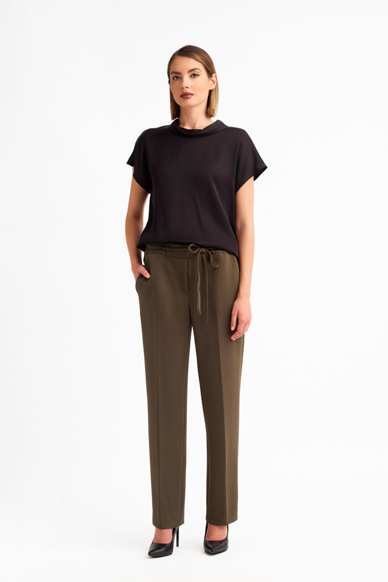 Μπλούζα σε σατέν βισκόζι με ζαπονέ μανίκια και λοξό γιακά που γυρίζει και κουμπώνει πίσω. Το τελείωμα διαθέτει φαρδύ στρίφωμα με μικρά ανοίγματα στο πλάι, προσθέτοντας μια διακριτική αλλά κομψή λεπτομέρεια. Ένα ρούχο λιτό αλλά με ιδιαίτερες γραμμές που χαρίζει άνεση και στυλ.