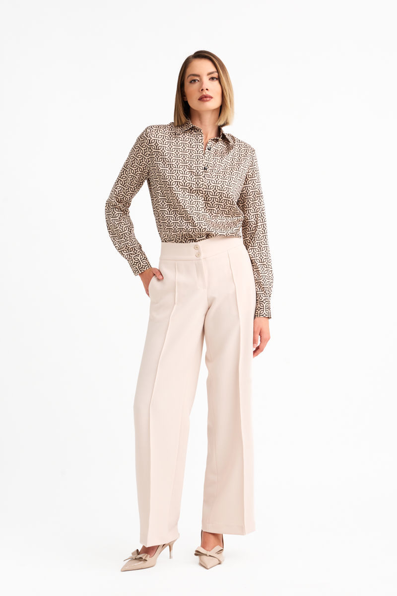 Πουκάμισο με μοντέρνο γεωμετρικό σχέδιο σε αποχρώσεις μαύρου και βανίλιας. Διαθέτει ίσια γραμμή που κολακεύει τη σιλουέτα, ελαφρώς καμπύλο στρίφωμα και πατιλέτα με κρυφό κούμπωμα για κομψή, καθαρή εμφάνιση. Ιδανικό για office chic ή smart casual συνδυασμούς.